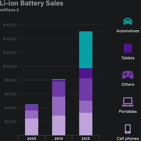 Lithium-ion batteries are currently in every cell phone, laptop, tablet, and power tool. Now, a massive amount of lithium batteries are being used by electric vehicles. Goldman Sachs estimates that a Tesla Model S with a 70kWh battery uses 63 kilograms of lithium carbonate equivalent (LCE) – more than the amount of lithium in 10,000 cell phones. Lithium is also valuable for large grid-scale storage and home battery storage. Perhaps there soon may be battery-powered airplanes…